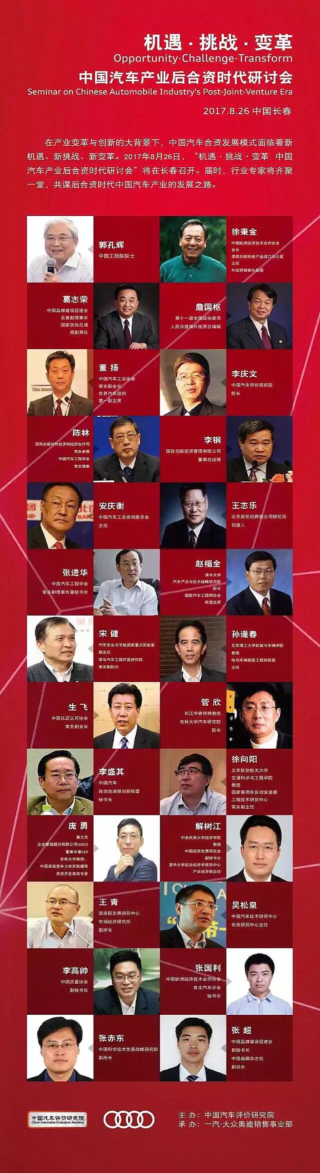 8月26日,由中国汽车评价研究院主办、一汽-大众奥迪承办的“机遇·挑战·变革 中国汽车产业后合资时代研讨会”在长春隆重召开。中国工程院院士郭孔辉,中国欧洲经济技术合作协会会长徐秉金,中国品牌建设促进会名誉副理事长葛志荣,人民日报海外版原总编辑詹国枢,中国汽车工业协会常务副会长董扬,中国汽车评价研究院院长李庆文,原商务部对外投资和经济合作司商务参赞陈林,清华大学汽车产业与技术战略研究院院长赵福全,上海瀛之杰董事长庞勇,中国汽车技术研究中心政策研究中心主任吴松泉,国务院发展研究中心市场经济研究所副所长王青以及 20余位汽车行业权威专家、学者共聚于此,就中国汽车产业后合资时代的发展问题探讨战略设计与策略规划。